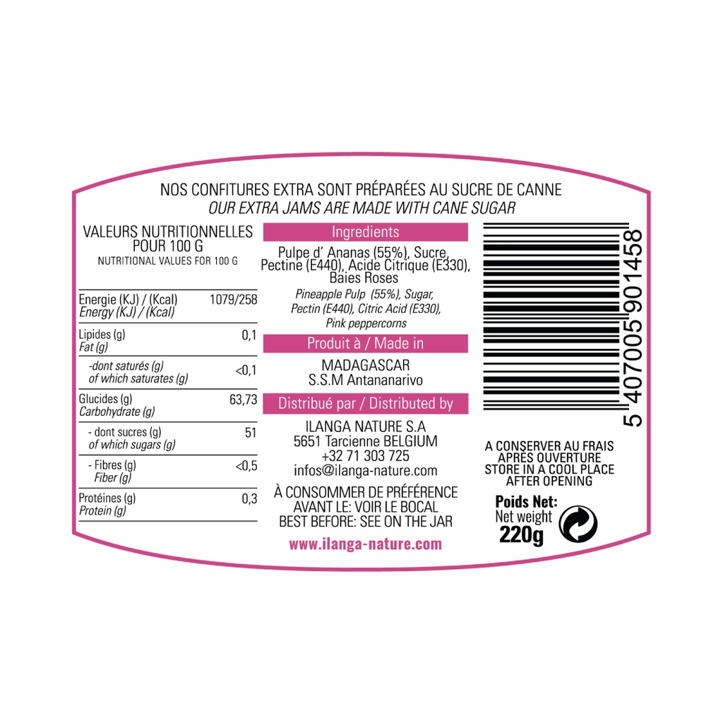 Plongez dans le monde enchanteur de la confiture d'ananas baies roses d' Ilanga Nature 220g, une délicieuse fusion de saveurs exotiques Madagascar.